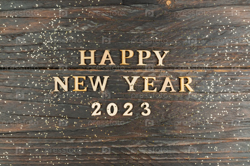 С Новым 2023 годом. Деревянный текст на деревянном фоне с разбросанными золотыми конфетти. Плоская укладка