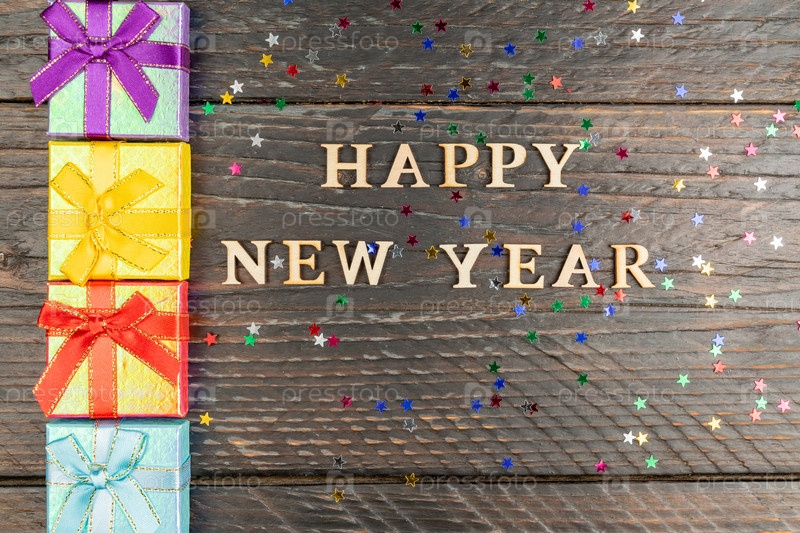 С новым годом праздничный фон. Подарочные коробки и деревянный текст. разноцветные звезды конфетти