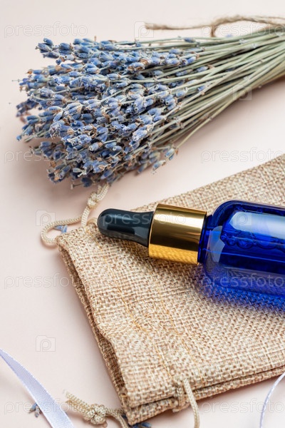 Бутылка синего стекла с косметическим маслом или сывороткой и цветами лаванды на бежевом фоне. Концепция аромата лаванды, уход за кожей. Макет