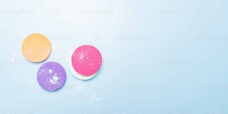Косметические губки и прозрачный минеральный порошок на синем фоне. Концепция макияжа, косметики для лица, ухода за кожей. Минимализм, вид сверху. Баннер