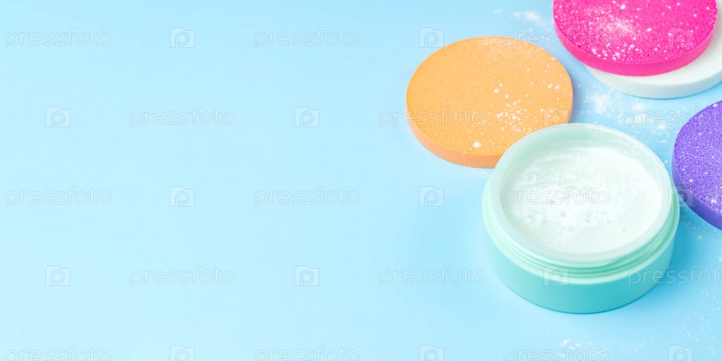 Набор женской косметики, рассыпчатая матовая минеральная пудра с красивой круглой губкой для макияжа на синем фоне. Баннер с копией пространства