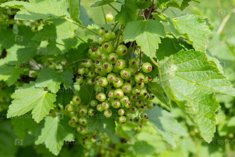 Незрелая красная смородина на кусте летом, крупный план незрелых зеленых ягод