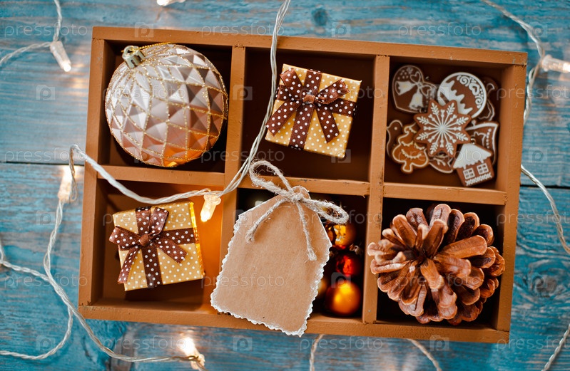Рождественские украшения находятся в коробке на синем деревянном фоне