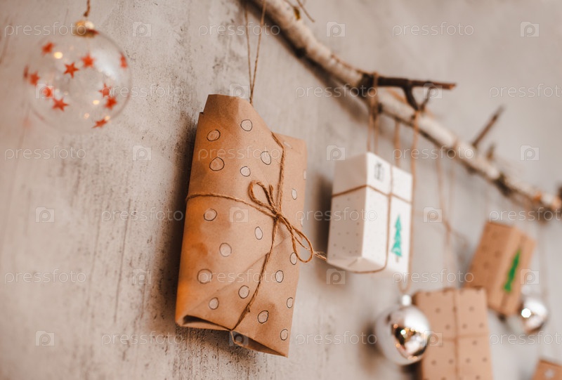 Рождественские подарки, упакованные в крафт-бумагу и украшения ручной работы, висят на веревке, привязанной к палке у серой бетонной стены