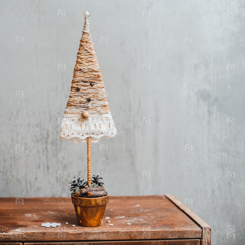 Текстильная елочка в горшке ручной работы. Бетонный серый фон. Новогодние украшения своими руками. Новогодние украшения своими руками. Свободное место для текста