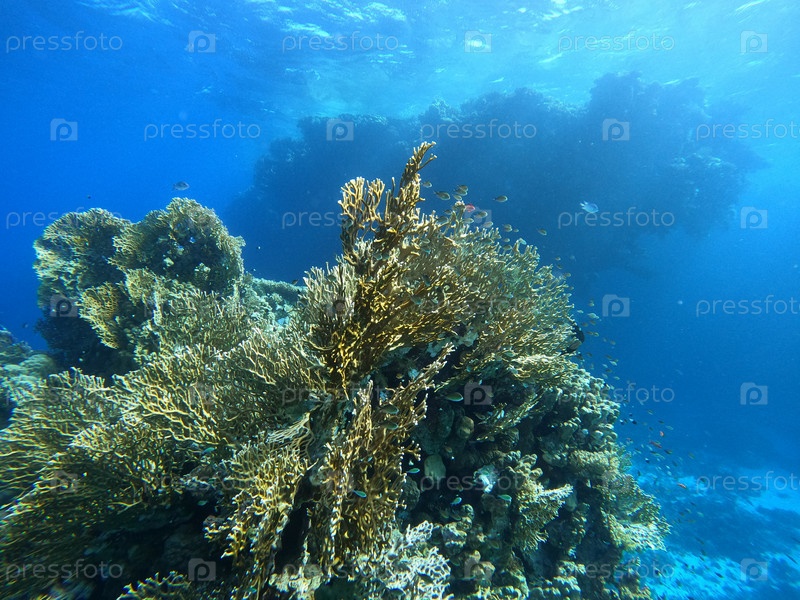 Колония красочных кораллов и мелких экзотических рыб на дне Красного моря в Египте, концепция путешествия