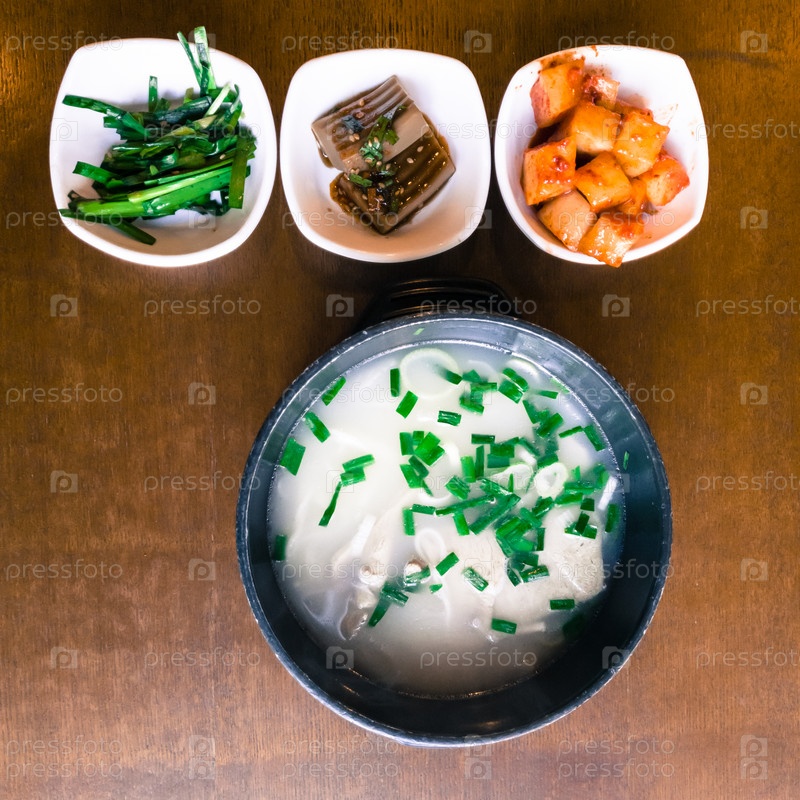 Вид сверху на суп из бычьей кости, молочный суп из говяжьей кости и несколько гарниров, Сеул, Южная Корея. Плоская планировка