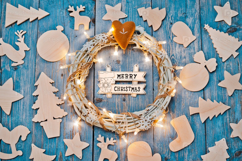 Новогодние украшения вокруг рождественского письма пустое место для текста горящие огни гирлянды на синем деревянном фоне. Вид сверху. Плоская укладка. копировать пространство коричневый деревенский стиль