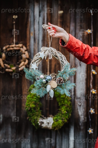 Вид сзади на молодых женщин-хипстеров, украшающих дом на Рождество у двери снаружи. Красивый венок рождественской елки на старом деревянном деревенском фоне