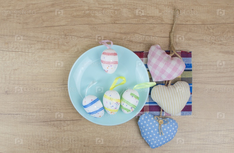Красочные пасхальные яйца на керамической круглой тарелке с красочной салфеткой. Вид сверху, сверху с копией пространства
