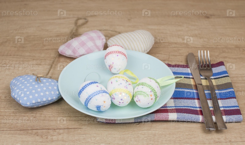 Красочные пасхальные яйца на керамической круглой тарелке с красочной салфеткой. Вид сверху, сверху с копией пространства