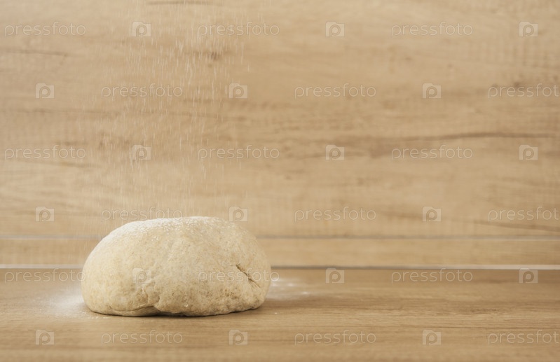 Шарик теста для пиццы на деревянном фоне с присыпкой мукой