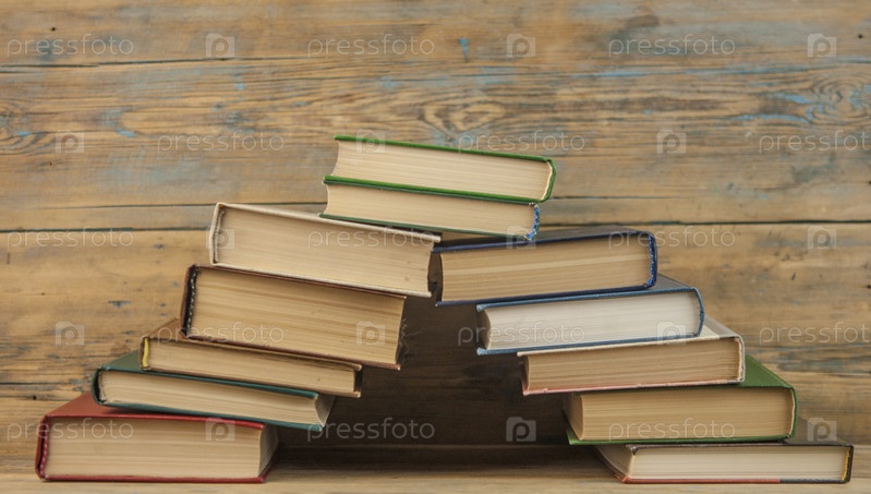 Стопка книг на деревянном столе на деревенском фоне с копией пространства