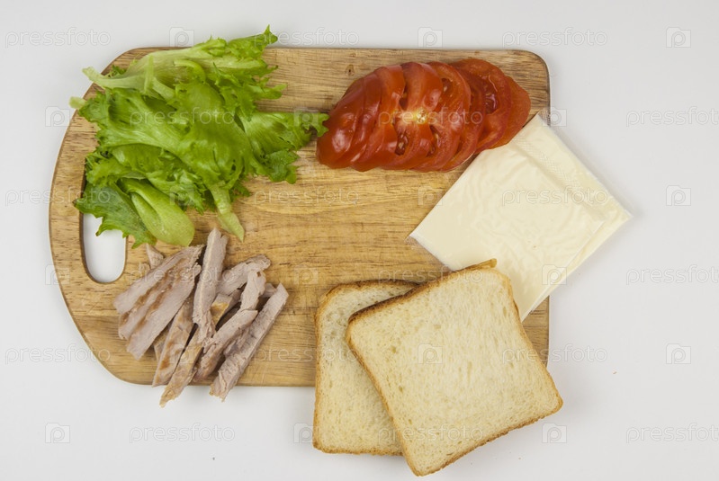 Бутерброд с ветчиной, сыром, помидорами, листьями салата и поджаренным хлебом. Вид сверху на белом фоне