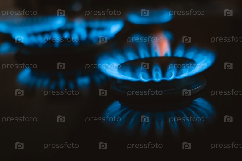 Современная кухонная плита с голубым пламенем горит