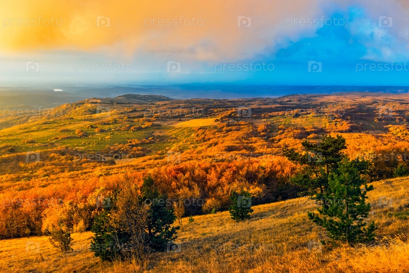 Плато чатыр-даг, освещенное закатным светом осенним вечером