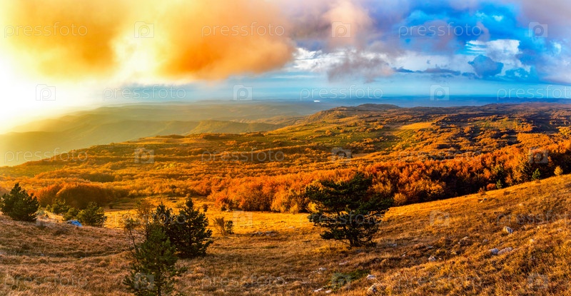 Плато чатыр-даг, освещенное закатным светом осенним вечером