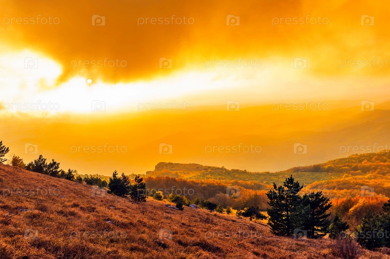Плато чатыр-даг, освещенное закатным светом осенним вечером