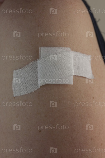 Женщина использует лейкопластырь на руке после инъекции вакцины