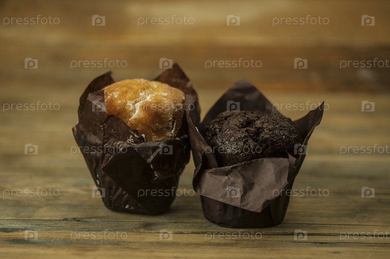 Домашние шоколадно-ванильные кексы на деревянном столе, посыпанные сахарной пудрой