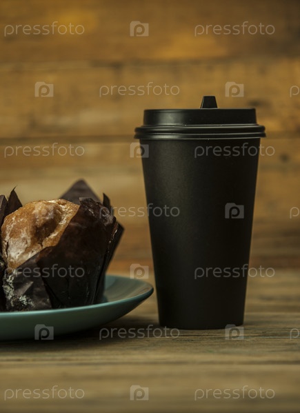 Домашние шоколадные и ванильные кексы с бумажной одноразовой кофейной чашкой на деревянном столе, посыпанные сахарной пудрой. Завтрак