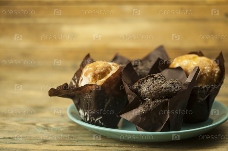 Домашние шоколадные и ванильные кексы лежат на керамической тарелке на деревянном столе, посыпанные сахарной пудрой. Завтрак