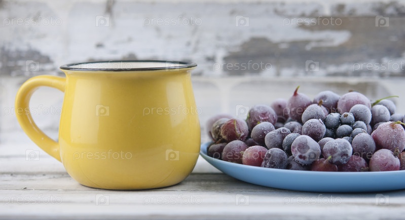 Замороженные ягоды фрукты фон в керамической тарелке крупным планом. Фрукты с морозом. на старинных белых деревянных досках, пустое место для текста, место для копирования