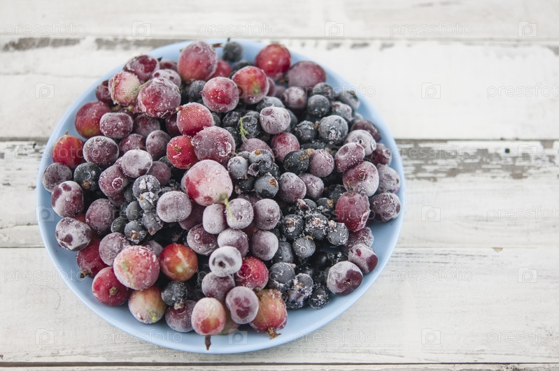 Замороженные ягоды фрукты фон в керамической тарелке крупным планом. Фрукты с морозом. на старинных белых деревянных досках, пустое место для текста, место для копирования