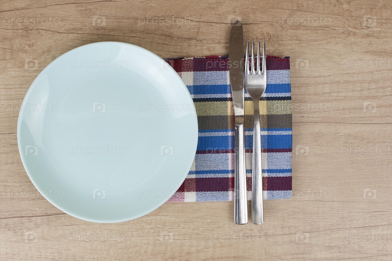 Пустая тарелка, нож, вилка и полотенце на фоне деревянного стола. Вид сверху с копией пространства