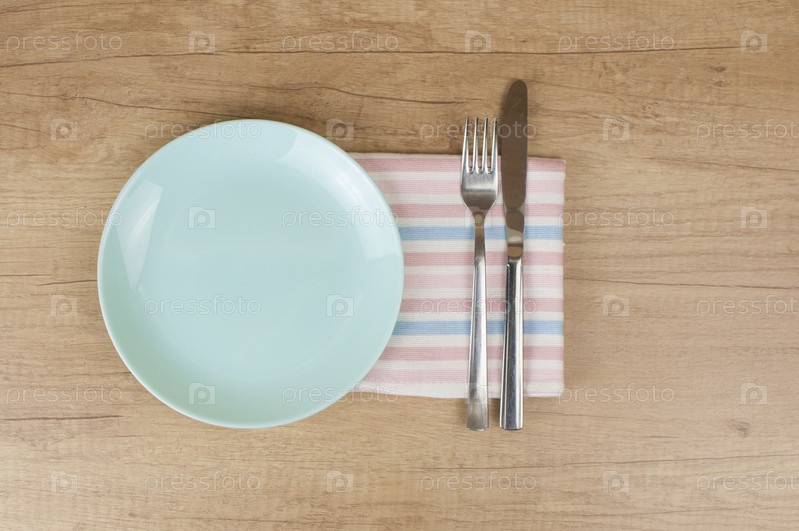 Пустая тарелка, нож, вилка и полотенце на фоне деревянного стола. Вид сверху с копией пространства