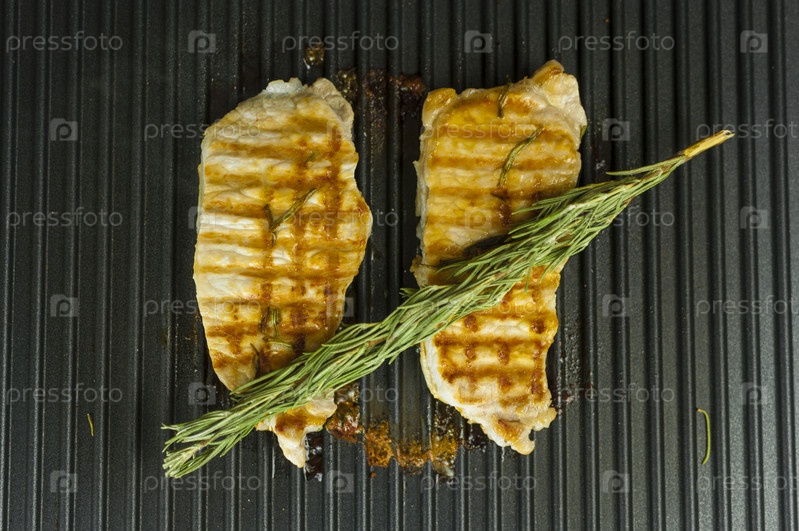 Кусок свежего мяса с крупной солью и веточкой розмарина. Сочный стейк из свинины на электрогриле