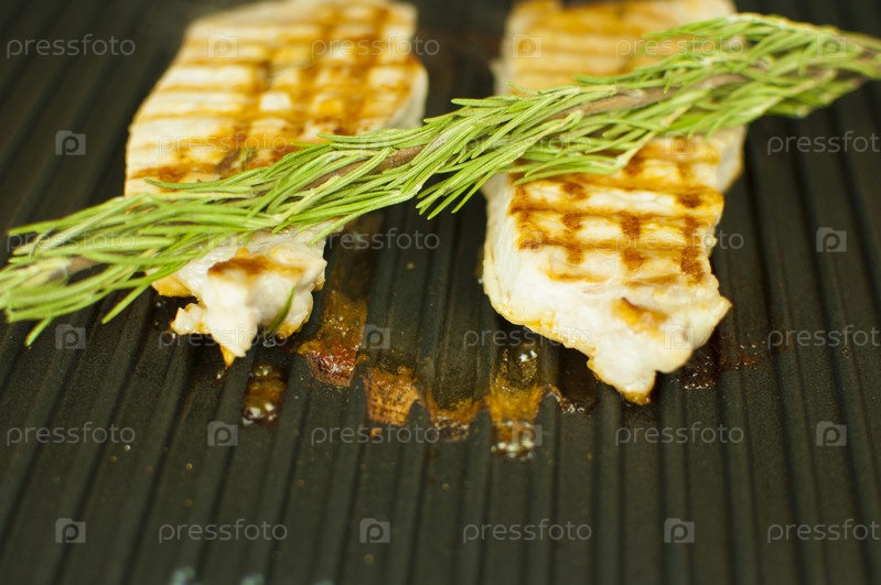 Кусок свежего мяса с крупной солью и веточкой розмарина. Сочный стейк из свинины на электрогриле