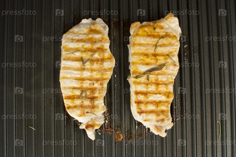Барбекю-вечеринка. Вкусные стейки из свинины на контактном электрическом гриле крупным планом. Готовим на домашней кухне