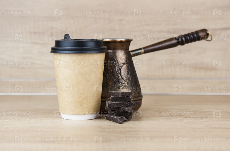 Одноразовые чашки для макетов на вынос и куча темного шоколада на деревянном фоне с копией пространства