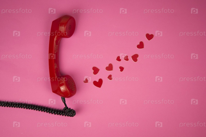 Старый телефон и красное сердце на фоне розовой бумаги. День Святого Валентина