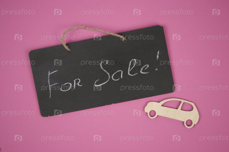 Деревянный мини игрушечный автомобиль с доской на розовом фоне. ДЛЯ ПРОДАЖИ написано на доске. Концептуальный