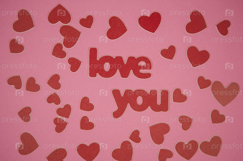 Слово люблю тебя и красные сердца на розовом фоне. Открытка на день рождения или день Святого Валентина