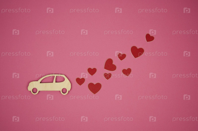 Маленькая игрушечная машинка с множеством красных сердечек на день святого валентина на розовом фоне. Тема любви и праздника. Открытка на день рождения или день Святого Валентина