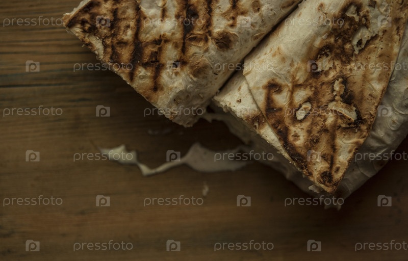 Сэндвич с шаурмой на белом деревянном столе с арабским соусом