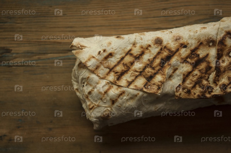 Сэндвич с шаурмой на белом деревянном столе с арабским соусом