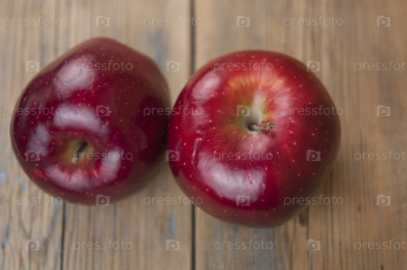 Два ярко-красных и готовых к употреблению яблока в деревенском амбаре со старыми деревянными досками и комнатой или местом для копирования, текста, ваших слов
