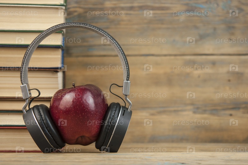 Стопка книг с красным яблоком и наушниками на деревянном столе с копирайтом
