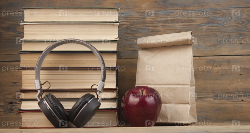 Стопка книг с красным яблоком и наушниками на деревянном столе с копирайтом