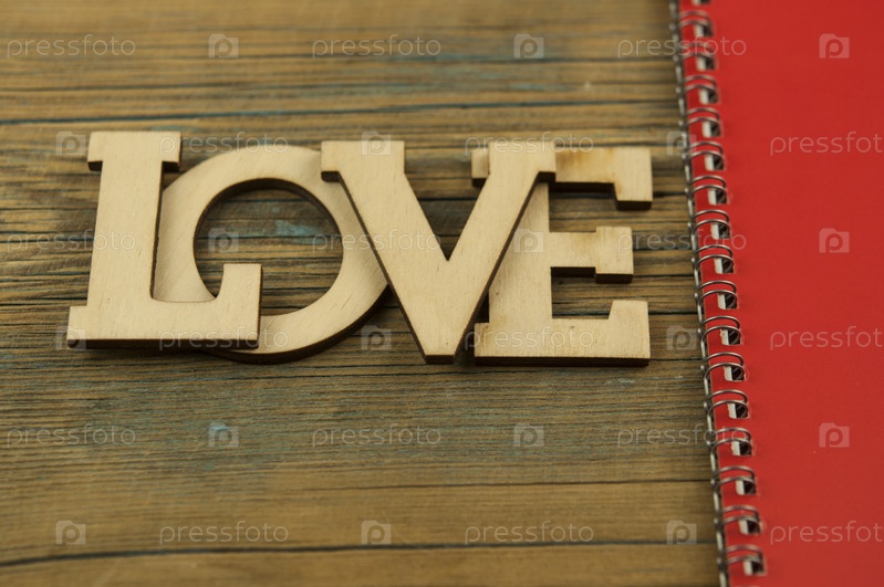 Любовное слово, маленькие сердечки на фоне темного дерева. Вид сверху на День святого Валентина