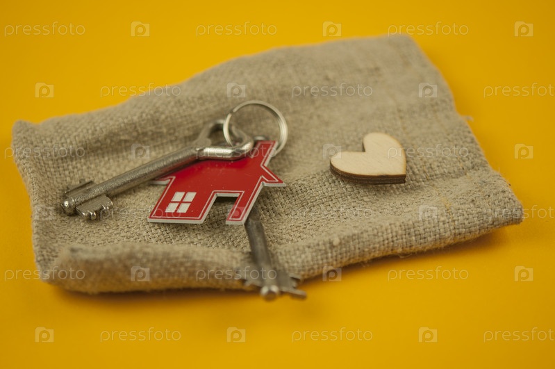 Расположение брелка в форме ключа и дома на цветном фоне. Вид сверху, плоская планировка. Недвижимость, концепция страхования, ипотека, покупка дома, концепция риэлтора