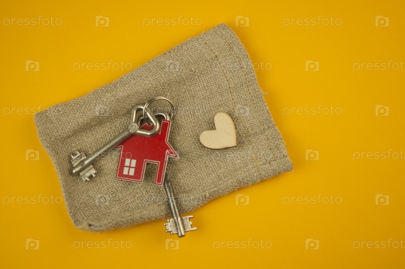 Расположение брелка в форме ключа и дома на цветном фоне. Вид сверху, плоская планировка. Недвижимость, концепция страхования, ипотека, покупка дома, концепция риэлтора