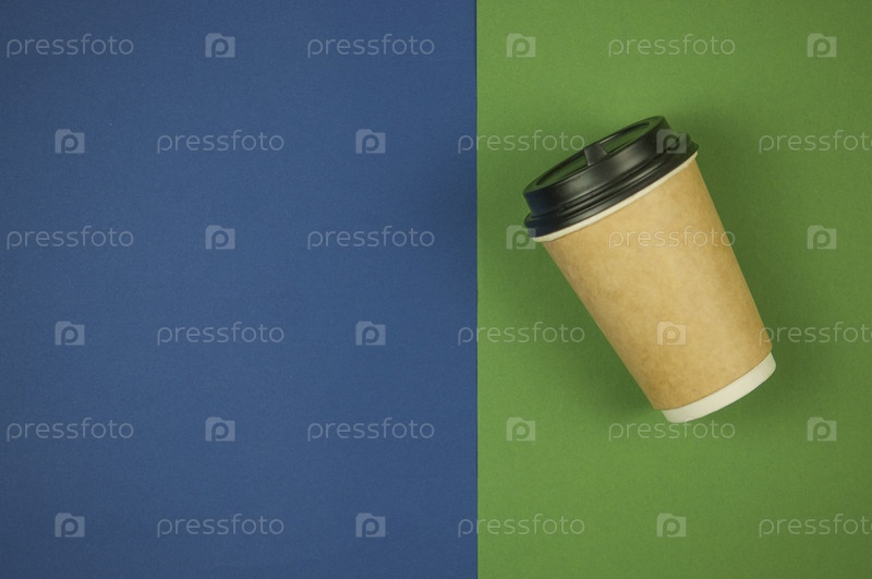Одноразовая бумажная чашка кофе лежит на зеленом и синем фоне