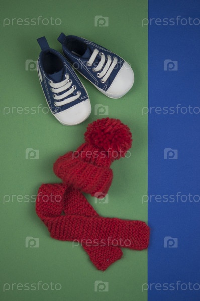 Синие детские кроссовки на зеленом и синем фоне