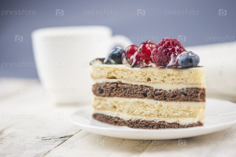 Смешайте ягодный чизкейк на белой тарелке на деревянном фоне