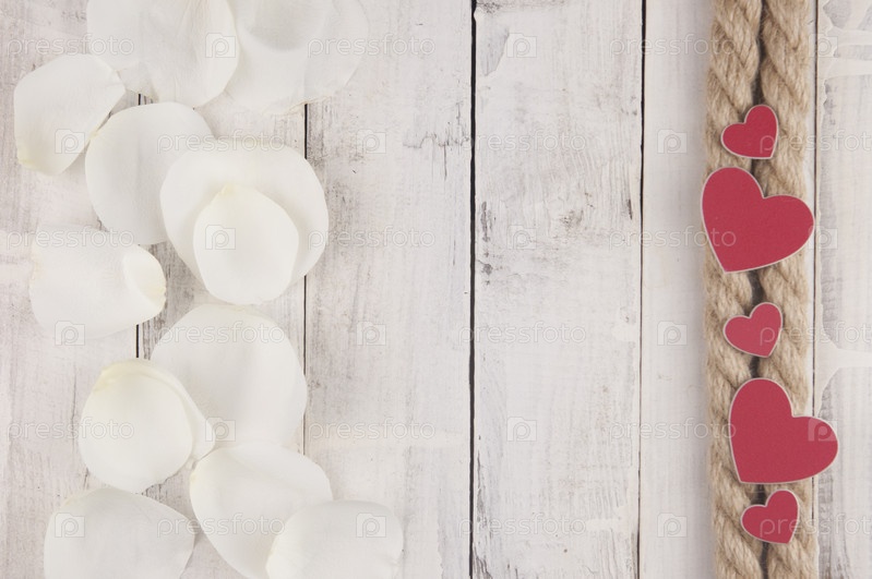 Пеньковая веревка с красными сердцами и лепестками белых роз на белом деревянном столе. День рождения. Свадьба. Праздничный день. Вид сверху. Копировать пространство